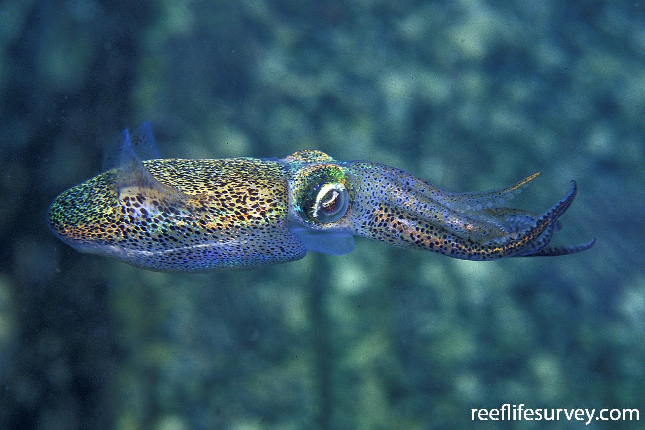 Typical dumpling squid body shape with iridescent green-yellow colouration and a covering of fine black spots. It remains hidden under sand during the day and is therefore generally seen only by divers on night dives.