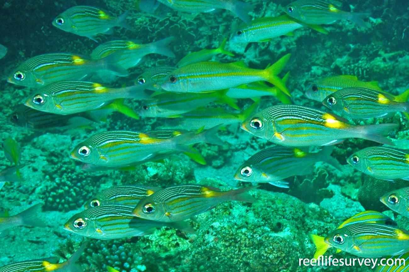 Broad gold stripe along lateral line with thin widely spaced gold lines below and darker more dense lines above, yellow blotch at rear base of dorsal fin and yellow patch at base of pectoral fin. Sometimes forms large aggregations low down over the reef.