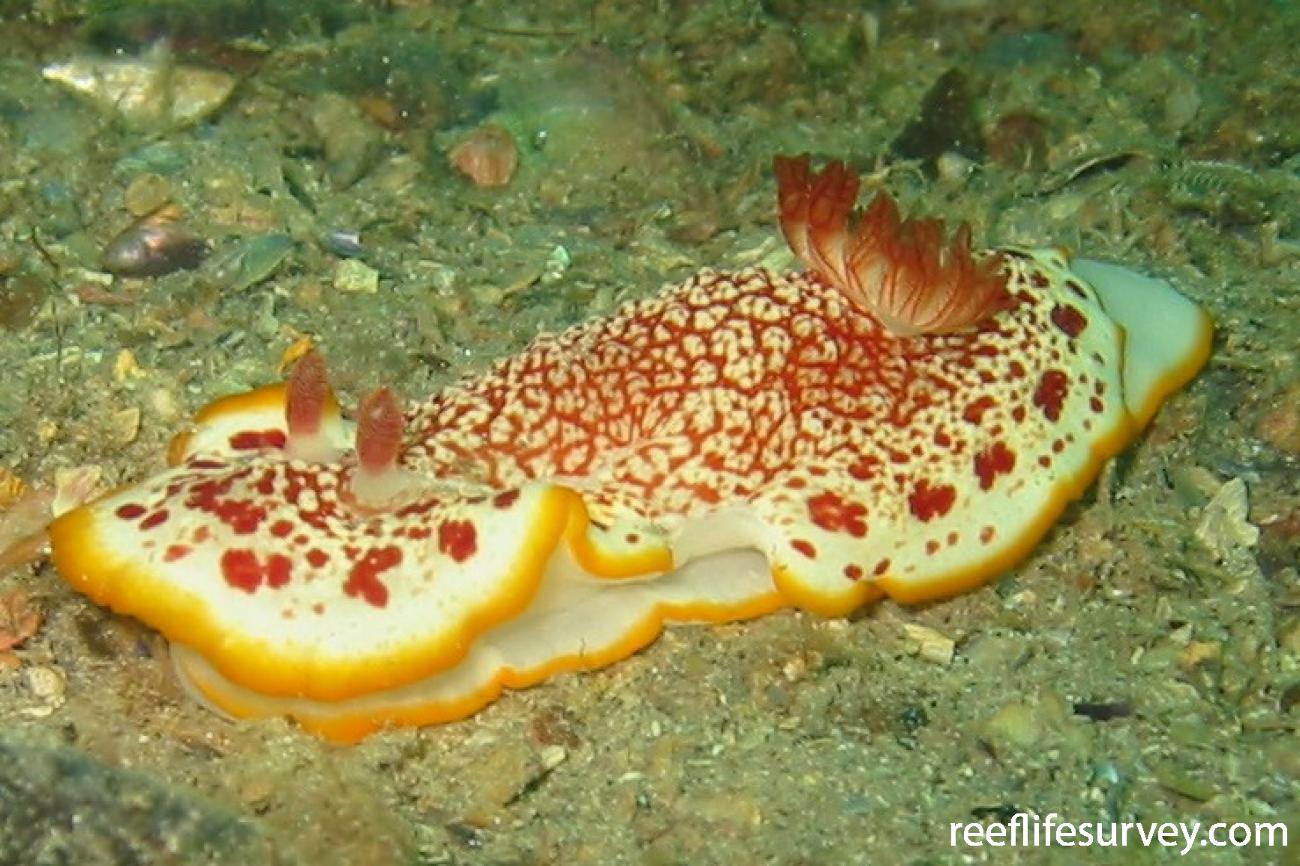 White body with a network of red lines over the upper body and orange margin bordered by red spots.