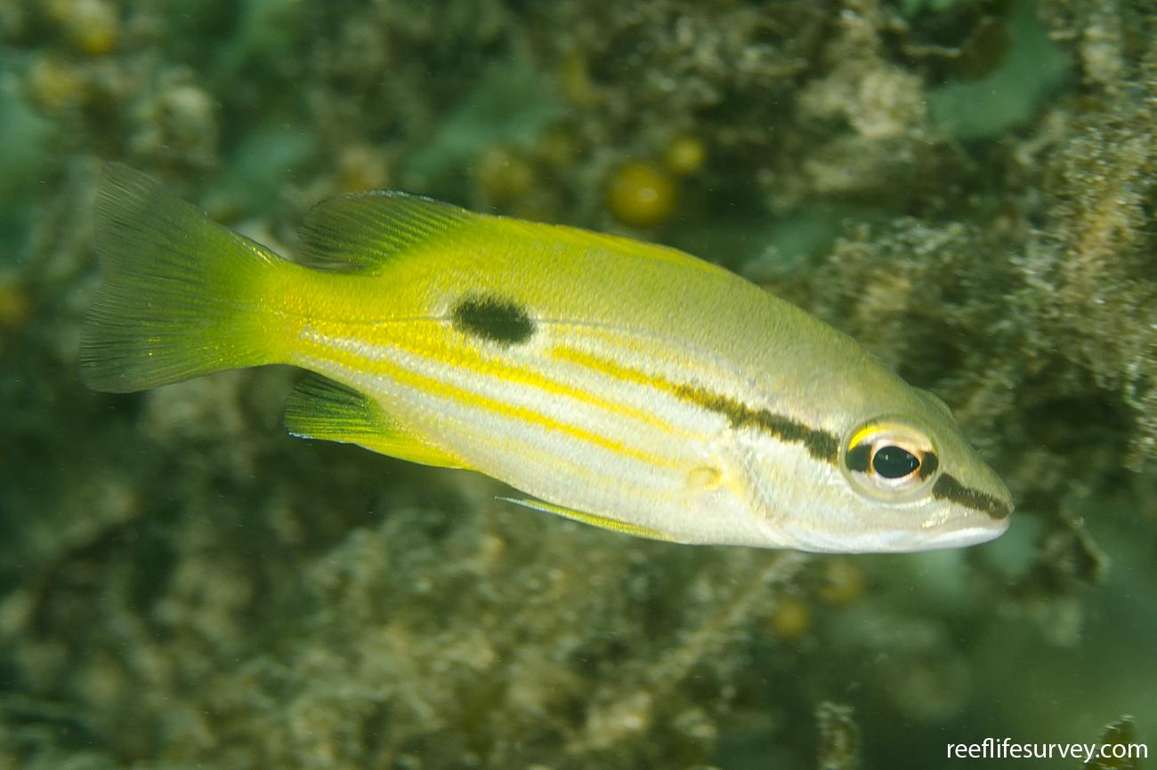 Light body with 5-7 thin yellow stripes of equal width on side, longest stripe continuing through eye to snout, rectangular black spot on lateral line three-quarters distance along body. L. carponatus (Stripey Snapper) lacks black blotch and L. ehrenbergii (Ehrenberg's Snapper) lacks stripes on head.