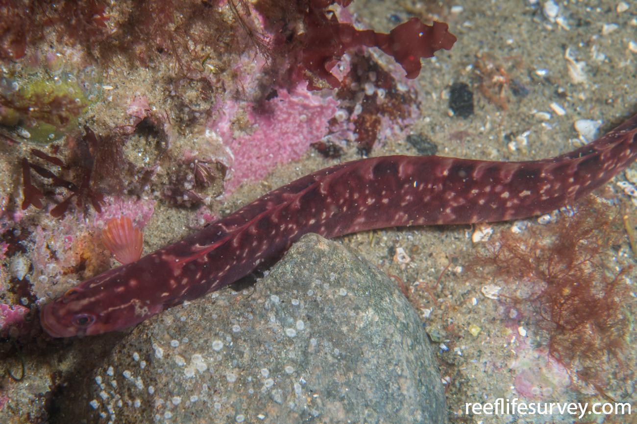 Growing up to 25cm in length, the ribbon-like body exhibits 9-13 eyespots along the base of the dorsal fin. May be found out of water sheltering under rocks or seaweeds, although can be found at depths up to 100m. Spawning occurs from November - January, with eggs closely guarded and often laid inside an empty bivalve shell or under a stone.