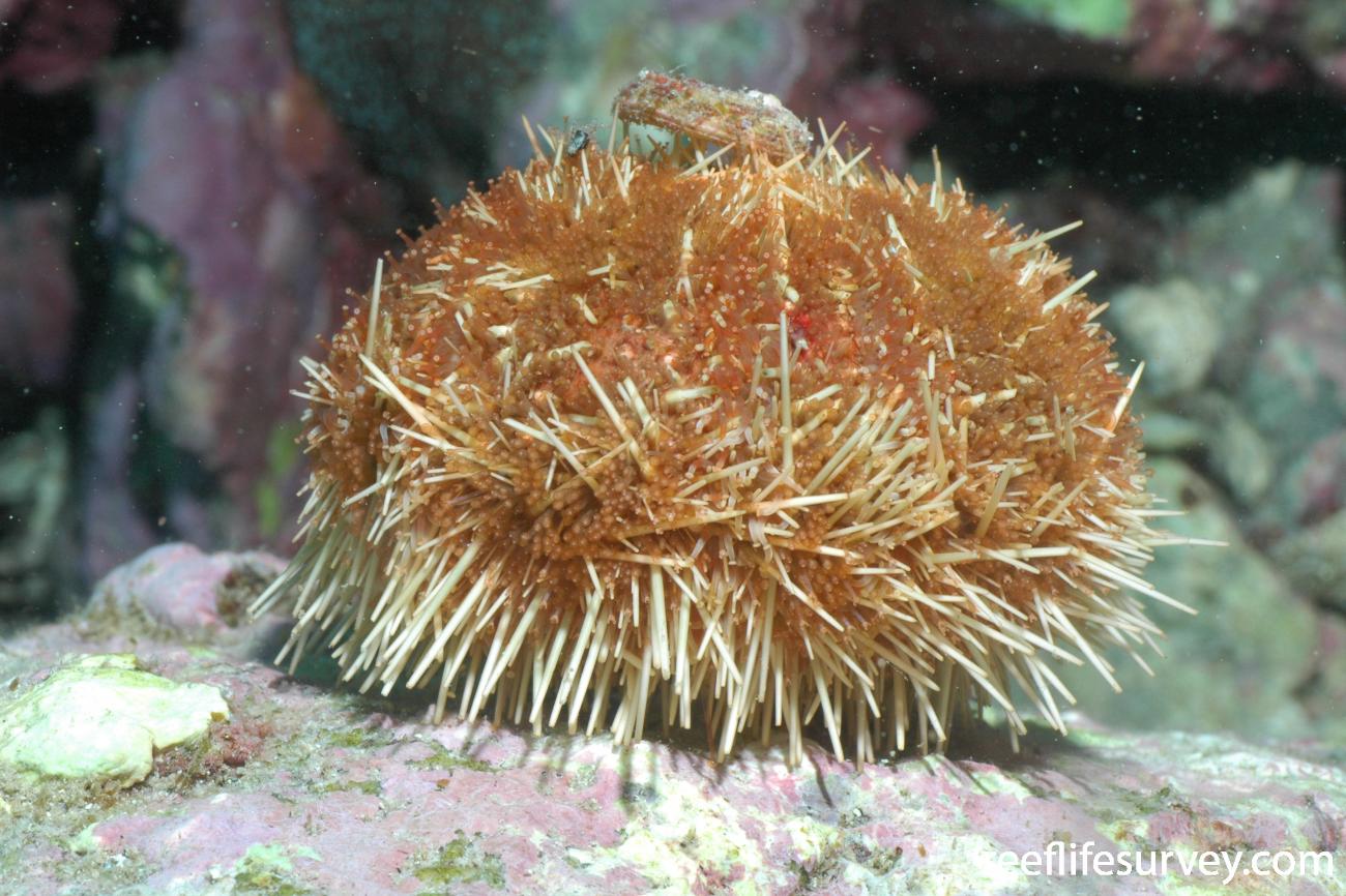 Test that can vary in colour between orange and dark purple, and primary spines that are white and sometimes tipped with orange. The relative size of the spines and their arrangement are nevertheless characteristic of the species. The test is often partly covered by shell and algal fragments, which are held in place by the characteristically banded tube feet. In some years the species is abundant in Sydney Harbour, but in other years it is rare, probably because of variation in the survival of larvae drifting south.